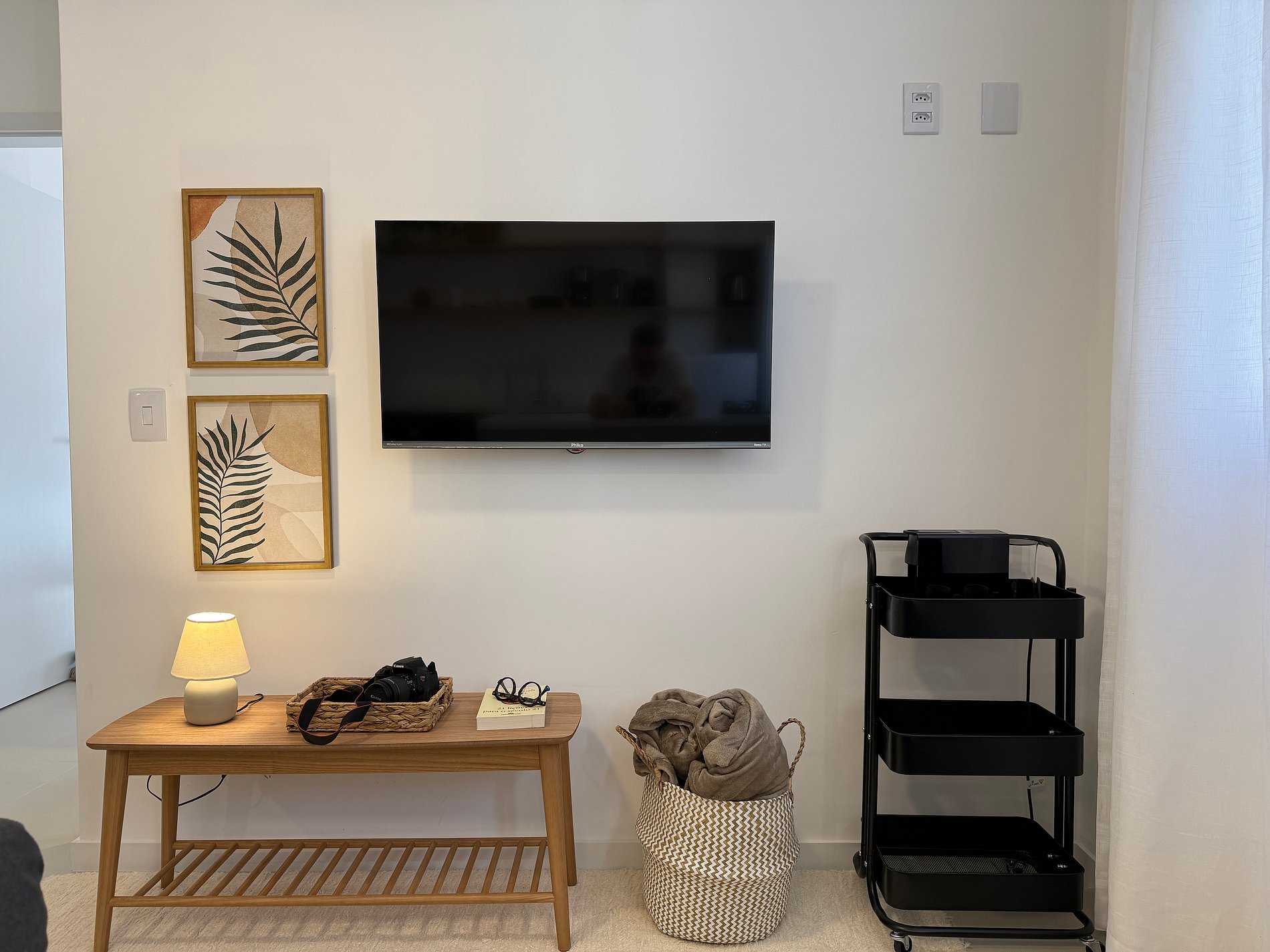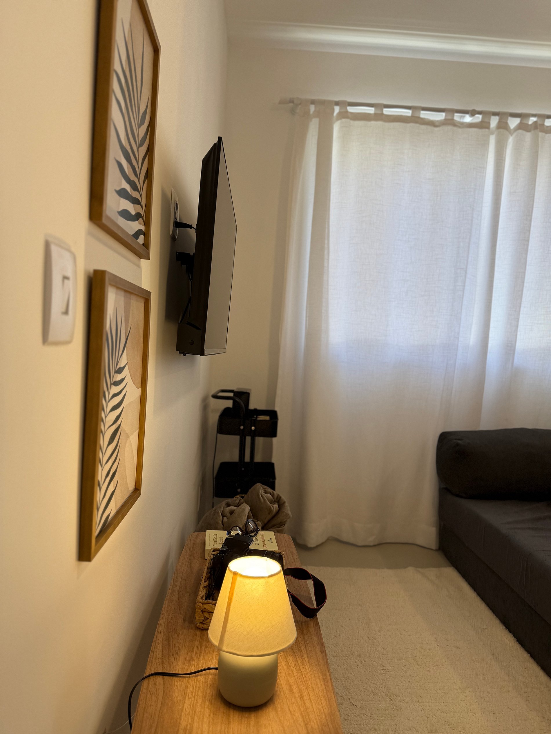 Sala integrada com sofá cama e TV, perfeita para relaxar depois da praia