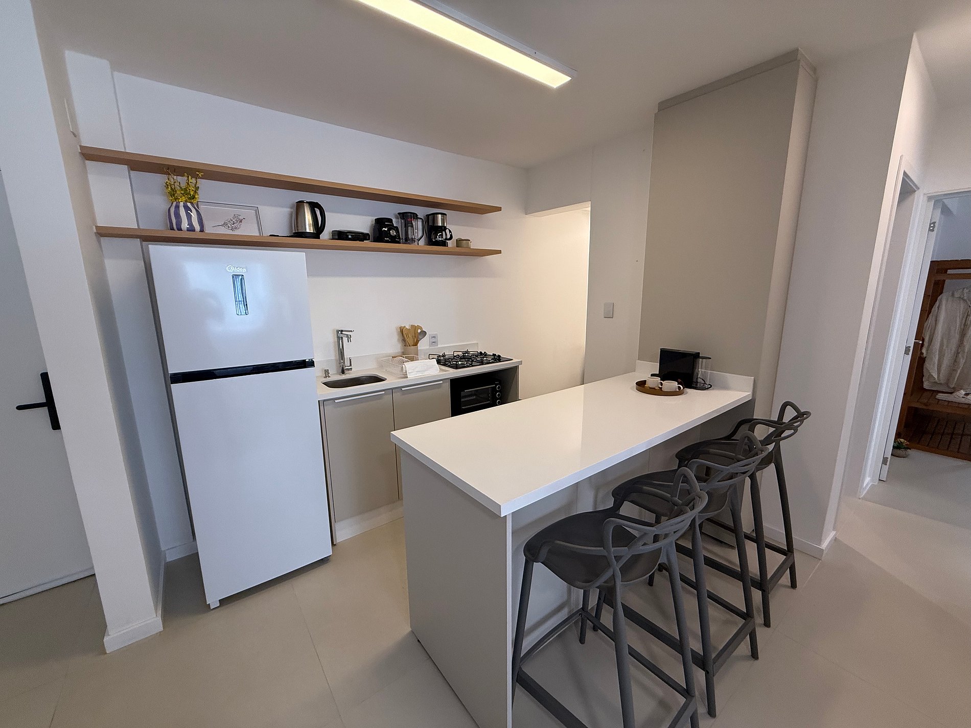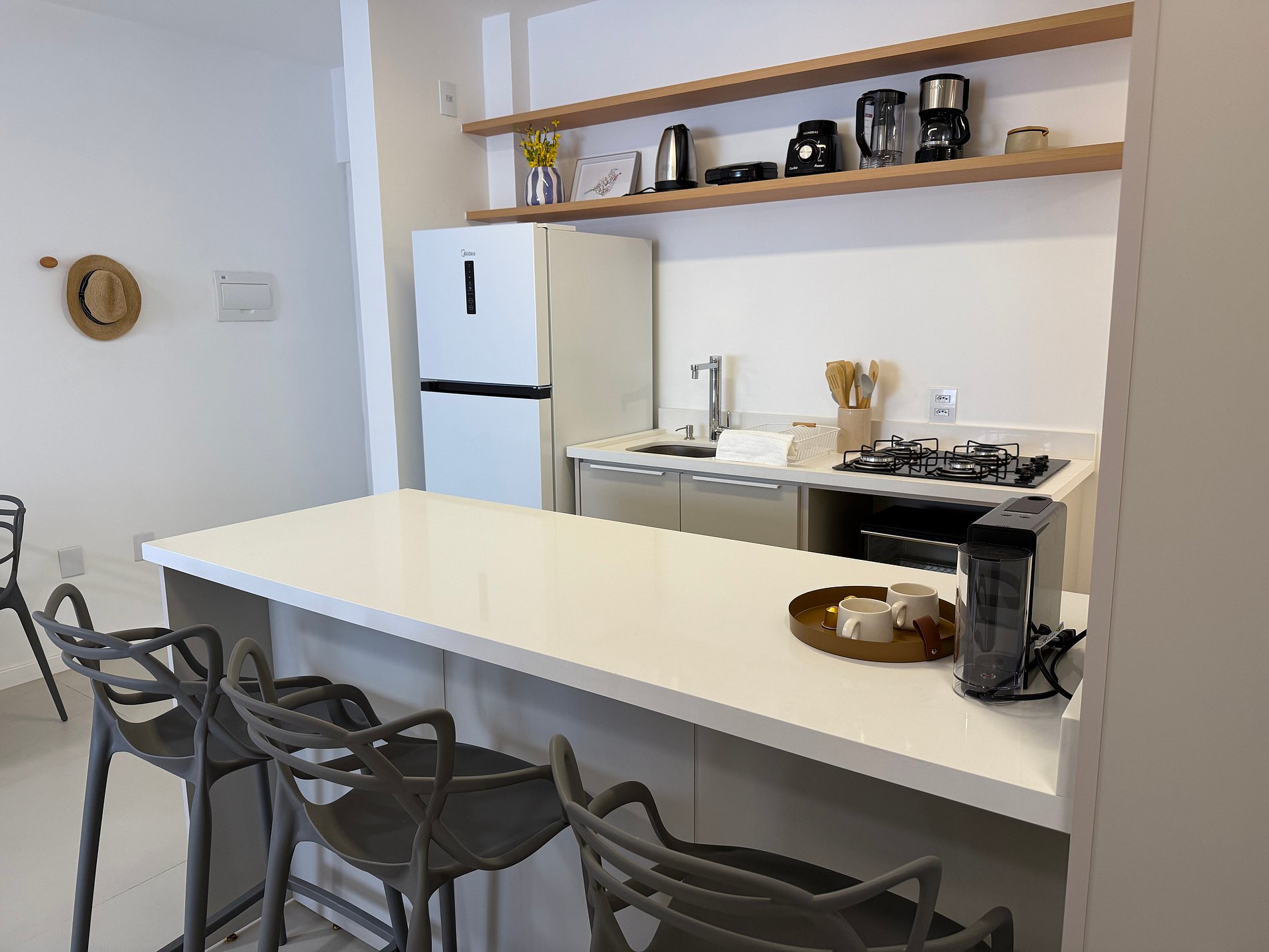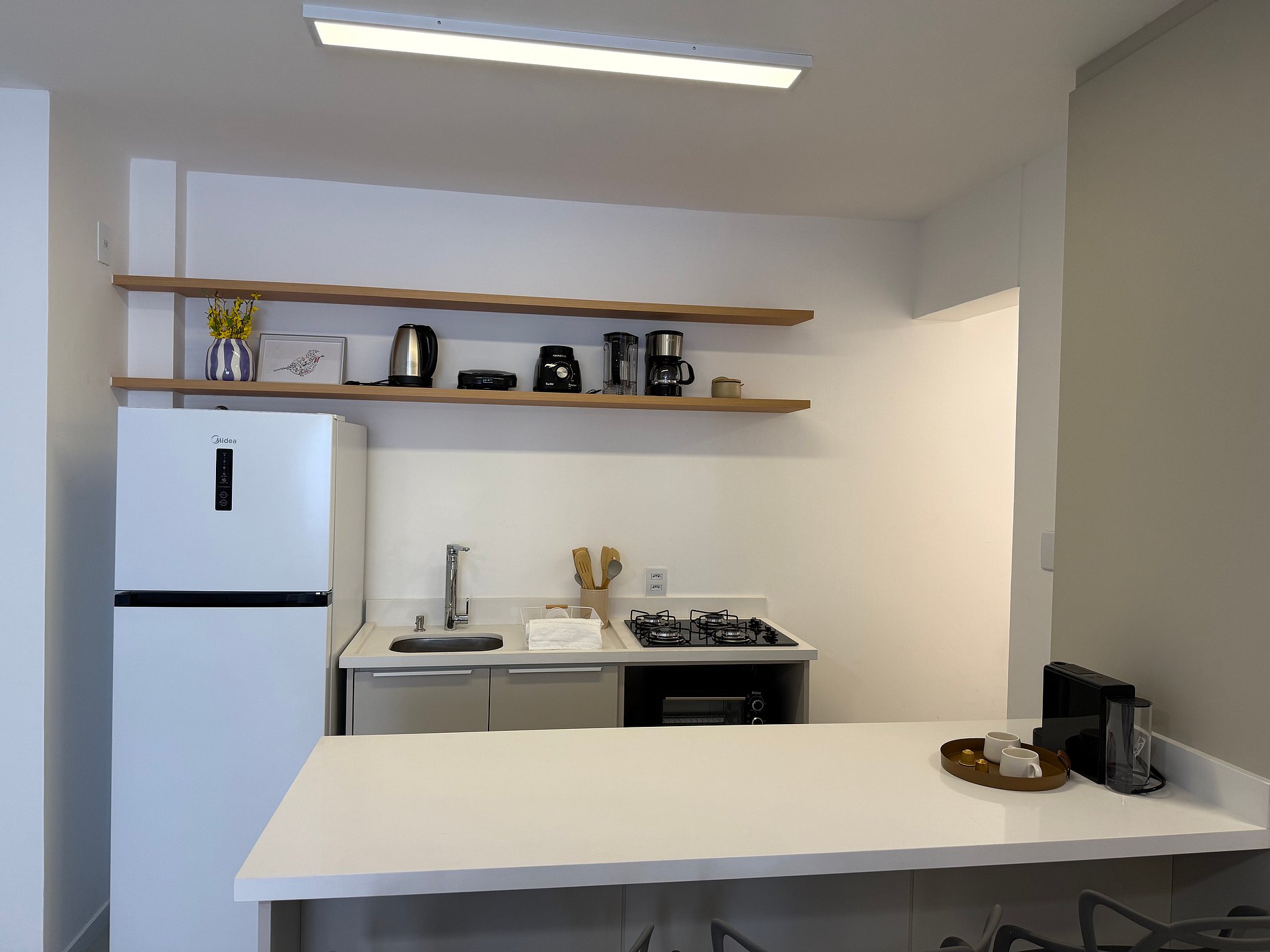 - Cozinha completa com cooktop, microondas, forno elétrico, liquidificador, chaleira elétrica, cafeteira e sanduicheira.