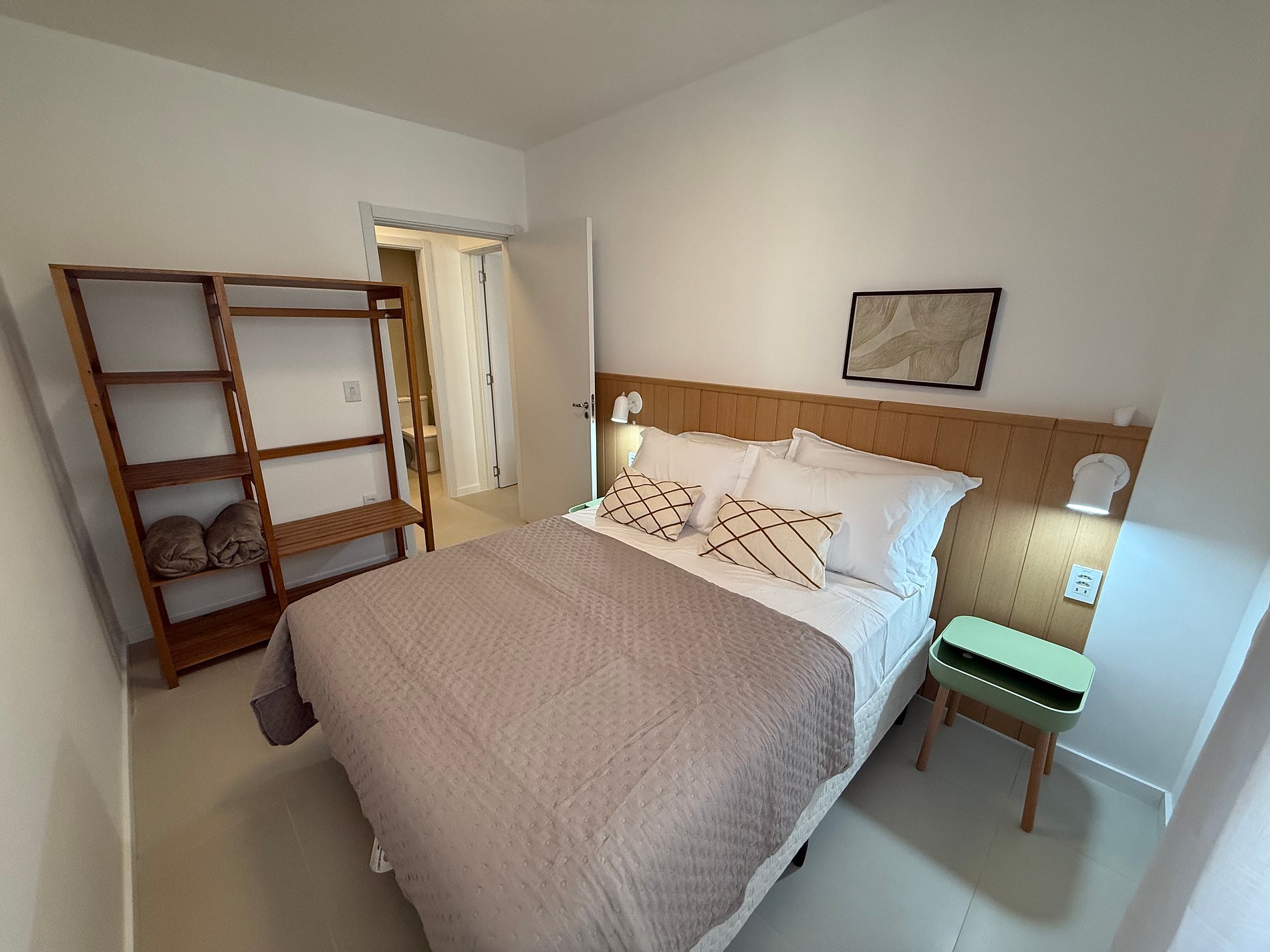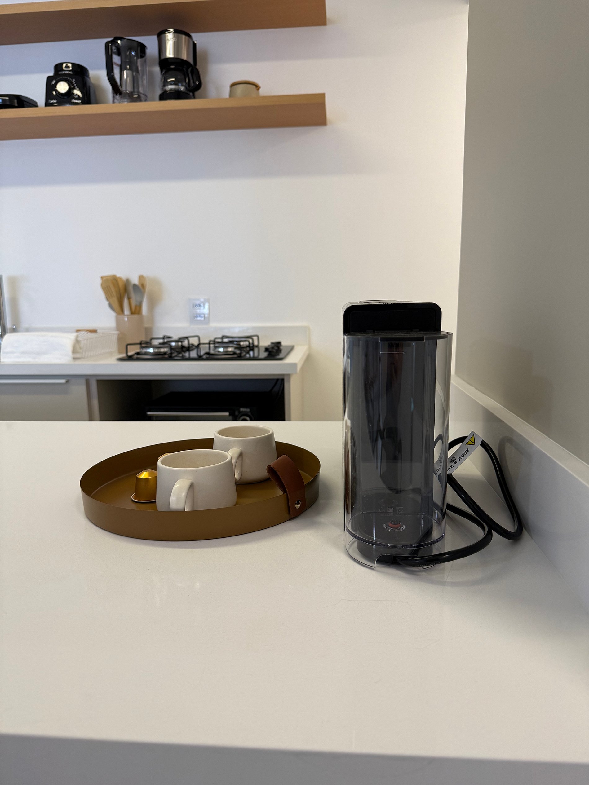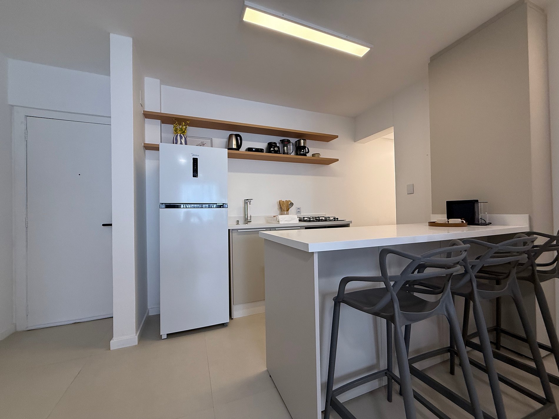 - Cozinha completa com cooktop, microondas, forno elétrico, liquidificador, chaleira elétrica, cafeteira e sanduicheira.