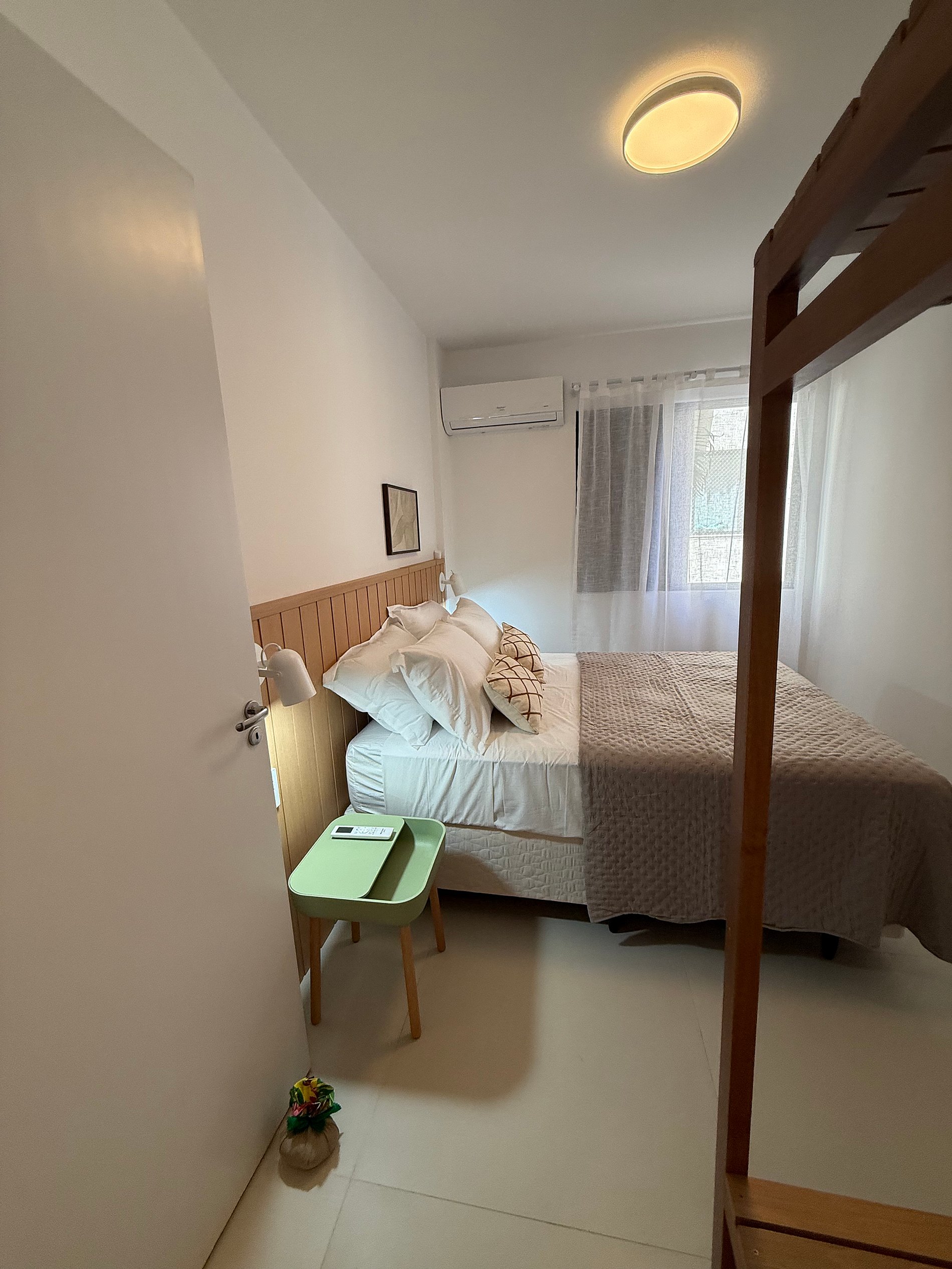 - Quarto com cama box de casal e ar condicionado quente e frio.