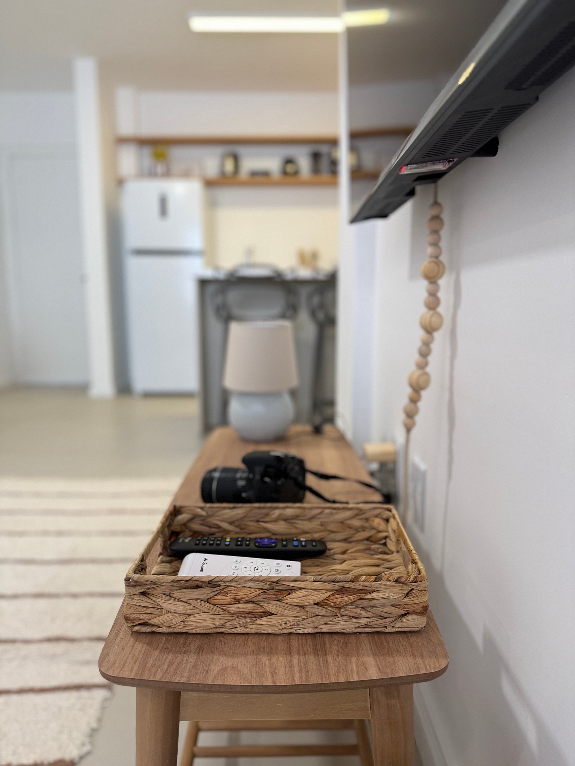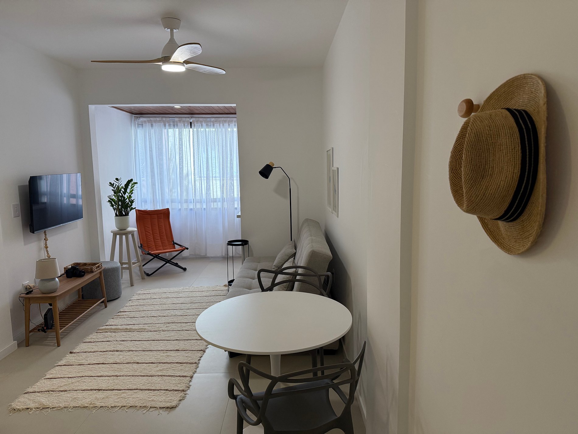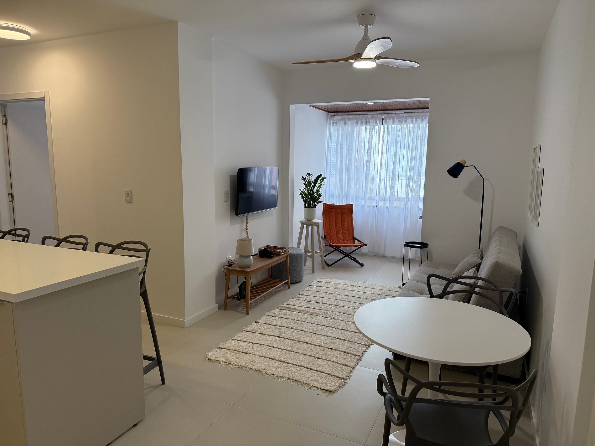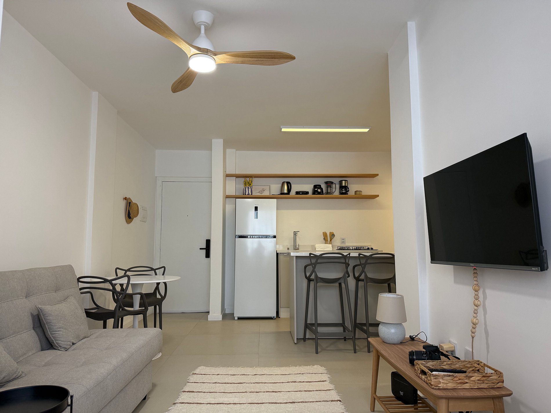 - Sala com sofá cama confortável para até 2 pessoas, com TV Smart, Wifi, ventilador de teto e cantinho do café para você saborear um delicioso expresso, aproveitando o amplo espaço do apartamento.